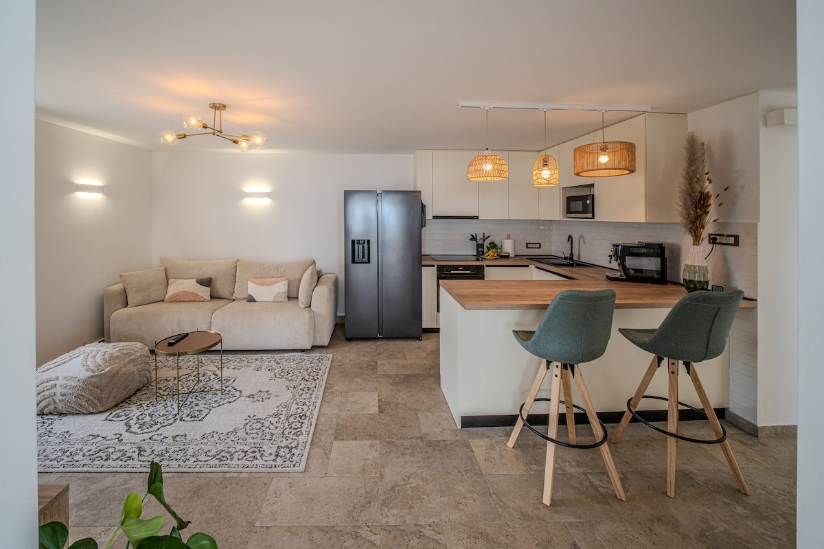 Apartment 3 mit nur wenigen Schritten zum hauseigenen Infinity-Pool und einer wunderschönen Terrasse. Ideal für Familien oder Pärchen mit Kindern. Unser Apartment verfügt über ein stilvoll eingerichtetes 2 Schlafzimmer mit komfortablem Doppelbett, welches Ihnen eine erholsame Nachtruhe garantiert. Das Wohnzimmer ist mit einer ausziehbaren Couch ausgestattet, die zusätzlichen Schlafplatz für 2 Gäste bietet.