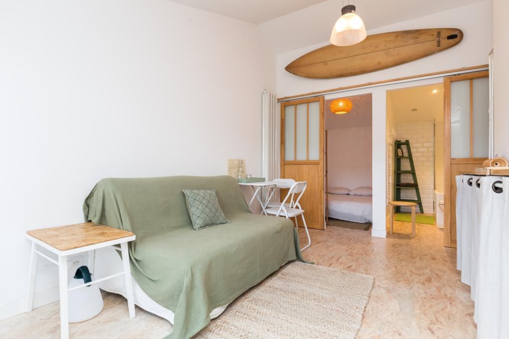 READ CAREFULLY to CHOOSE WISELY! La Casita: simple, clear and rejuvenating studio with the energy of wood associated with earthy colors, plus the old family surfboard! 20 m2: living room with sofa bed/kitchenette +1 bedroom and 1 bathroom with 140 cm bathtub. Outdoor space. Table and 2 chairs. Peaceful setting with lake 50 meters walk, and ocean 10/12 minutes by bike /5 minutes by car. Location between Bayonne and Hossegor. (Nor in town, nor on the ocean) Ideal for 2, extra charge for more