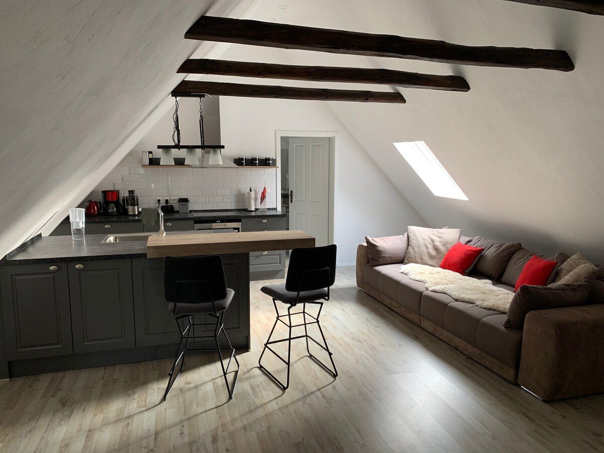 Kick back and relax in this calm, stylish space. In the attic of the converted, former stable overlooking forest, fields and meadows, you can make yourself comfortable on the balcony. Or stroll through the large garden. If you want to get to know traditional archery… our course is located opposite the forest! The apartment's kitchen is fully equipped. And in the bathroom there is also a washing machine. Welcome!
