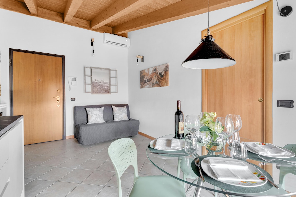 Elegante appartamento a 1.5 km dall'aeroporto di Orio al Serio BGY, vicinissimo al centro di Bergamo, ad Orio Center e alla Fiera di Bergamo. L'appartamento dispone di una camera con letto matrimoniale, soggiorno con divano letto a due posti, cucina attrezzata, fornelli a induzione, microonde, bollitore, macchina del caffè, tv, wifi, climatizzatore in camera e in soggiorno, bagno con doccia, phon e lavatrice. Self check-in e colazione offerta da noi. Parcheggio disponibile su richiesta.