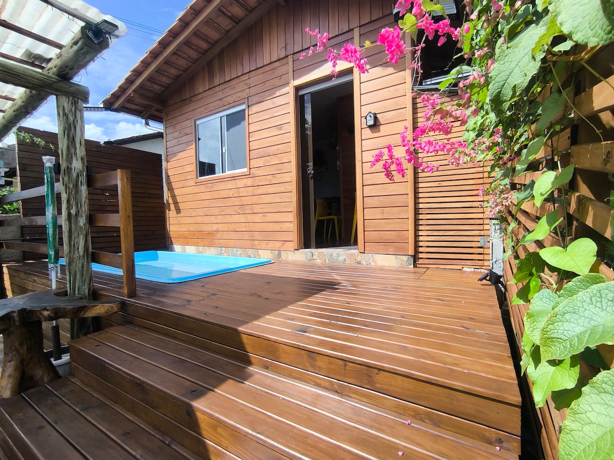 Beautiful wooden cabin, with a cozy garden, beautiful view for the late afternoon. Ideal for families and friends to enjoy the Beto Carreiro park, with the possibility of walking, and also for those who like to enjoy the beach. The cabin is located near the beautiful beaches of Penha, with hiking trails, a waterfall, deserted beaches, bars and restaurants. The house is on the same grounds as the owner's house. Distance from the beach - 700 meters Distance from Beto Carreiro - 800 meters