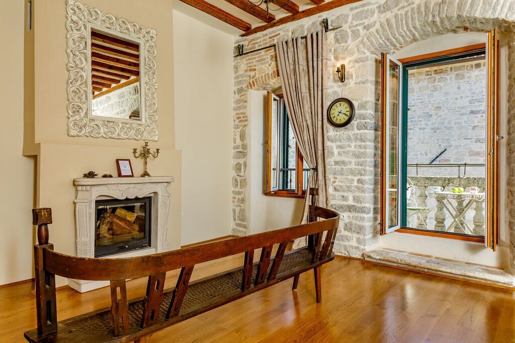 Historic three bedroom apartment situated within the walls of the old town Kotor. The apartament is situated on the second floor of historic building, once known as famous Lombardic palace from 17th century surronded by most beautiful squares in the city,and just few meters away from the main city gate, restaurants, bars and souvenir shops. 3 bedroom, 2 bathroom, huge living room with fire place and balcony, dining room with kitchen, with authentic spirit of Kotor old town.