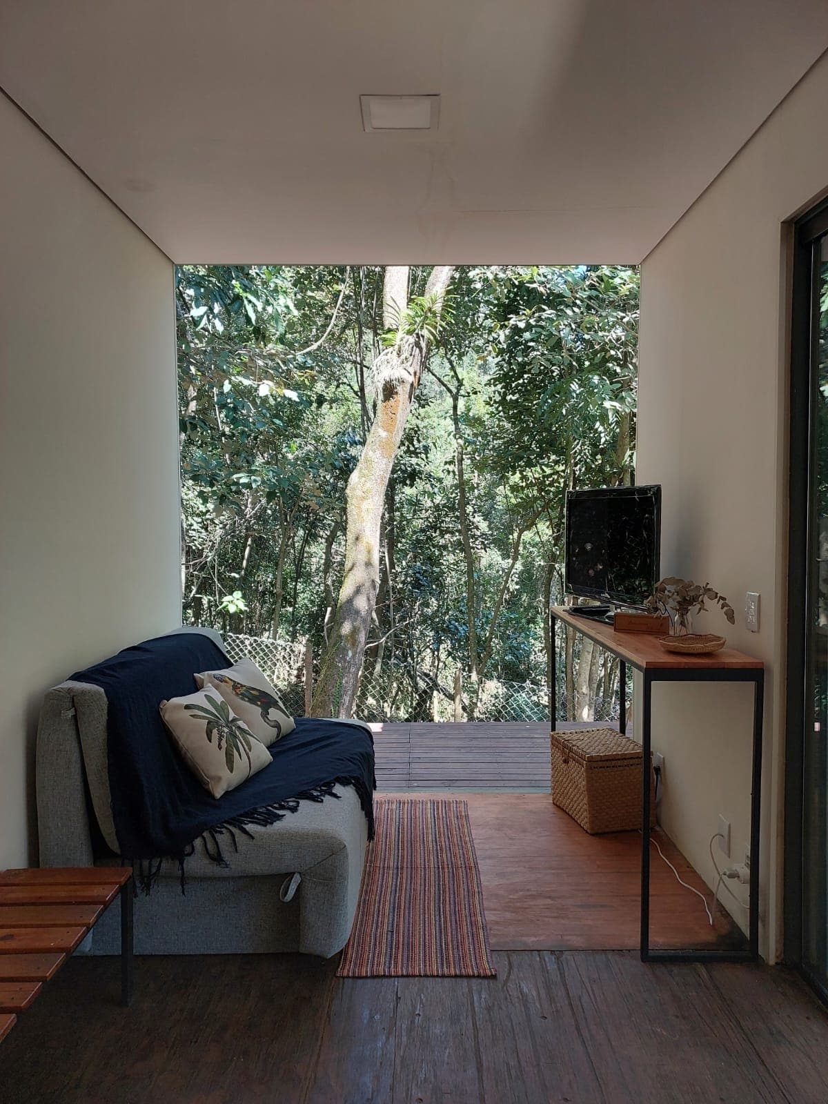 A perfect retreat in nature. The Vale do Cipó site features a hammock, barbecue grill, fire pit, picnic area, and deck for relaxing among the trees of the Atlantic Forest. A fully equipped kitchen and clean linens and towels are provided for your comfort. It's located 250 meters from the road, making it easy to access even on rainy days. The house has a private stream 30 meters away and is frequently visited by squirrels, butterflies, various birds, and many fireflies. Fenced grounds for pets.