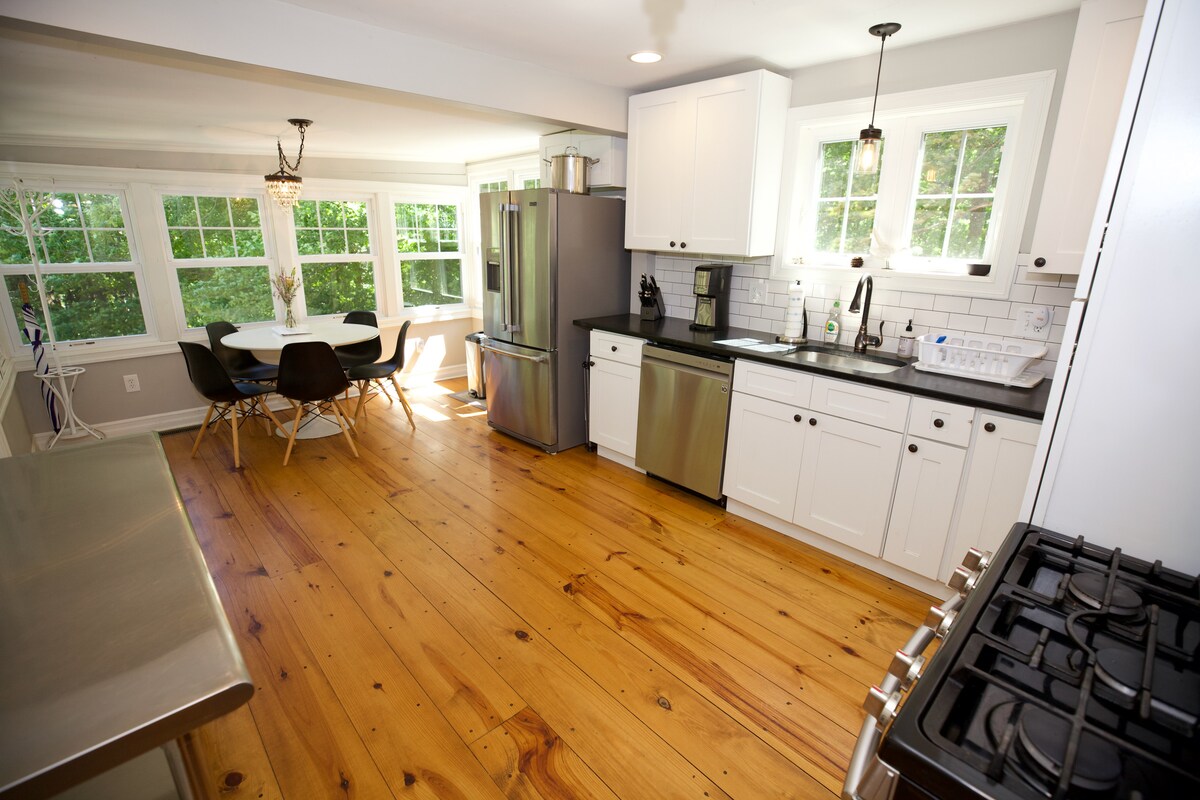 Welcome to our charming, old (but newly renovated!) Orchard Park Village Farmhouse! Large, but cozy, living and dining spaces and a huge kitchen with all the amenities. We have 2 large bedrooms, each is a "master suite" with bathroom and walk-in closets. In one bedroom, the king bed can be converted to 2 twins, if required. Queen sleeper sofa in living room. We're a short 1/4 mile walk to all the village shops, restaurants and coffee shops. 2 off-street parking spaces, wifi, AC, and laundry.