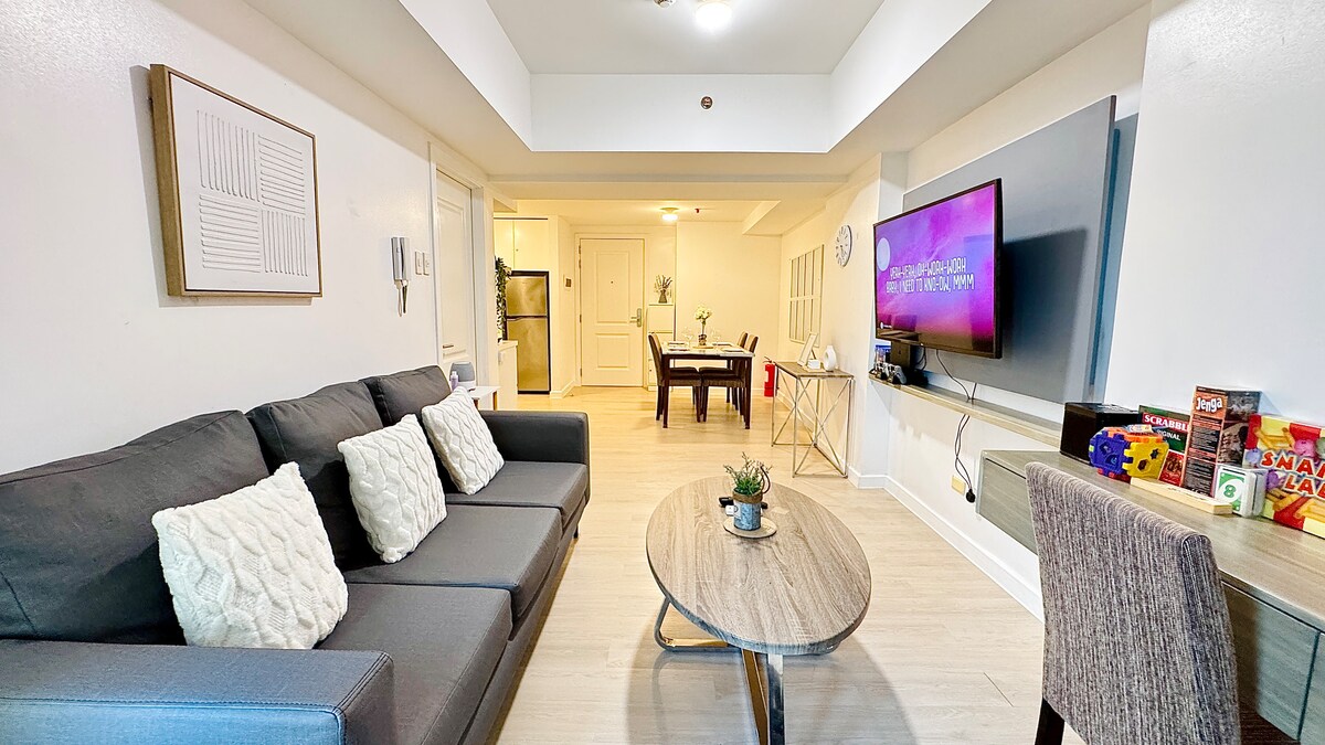 Our 𝐧𝐞𝐰𝐞𝐬𝐭 𝟏-𝐁𝐞𝐝𝐫𝐨𝐨𝐦 𝐔𝐧𝐢𝐭 — 𝐭𝐡𝐨𝐮𝐠𝐡𝐭𝐟𝐮𝐥𝐥𝐲 𝐝𝐞𝐬𝐢𝐠𝐧𝐞𝐝 𝐰𝐢𝐭𝐡 𝐚 𝐡𝐨𝐭𝐞𝐥-𝐬𝐭𝐲𝐥𝐞 𝐭𝐡𝐞𝐦𝐞 𝐚𝐧𝐝 𝐚 𝐬𝐥𝐞𝐞𝐤 𝐭𝐨𝐮𝐜𝐡 𝐨𝐟 𝐠𝐫𝐚𝐲. Enjoy the view of the garden, city, and pool. Unit Features: • 2 Balconies for fresh air and views • Spacious Dining Area — perfect for gatherings • Large Sala • Two 55” Smart TVs • PlayStation 4 for entertainment • Bedroom that comfortably fits 6+ guests • Big Comfort Room • Complete Toiletries Provided • Fully Equipped Kitchen — bring your ingredients and cook away!
