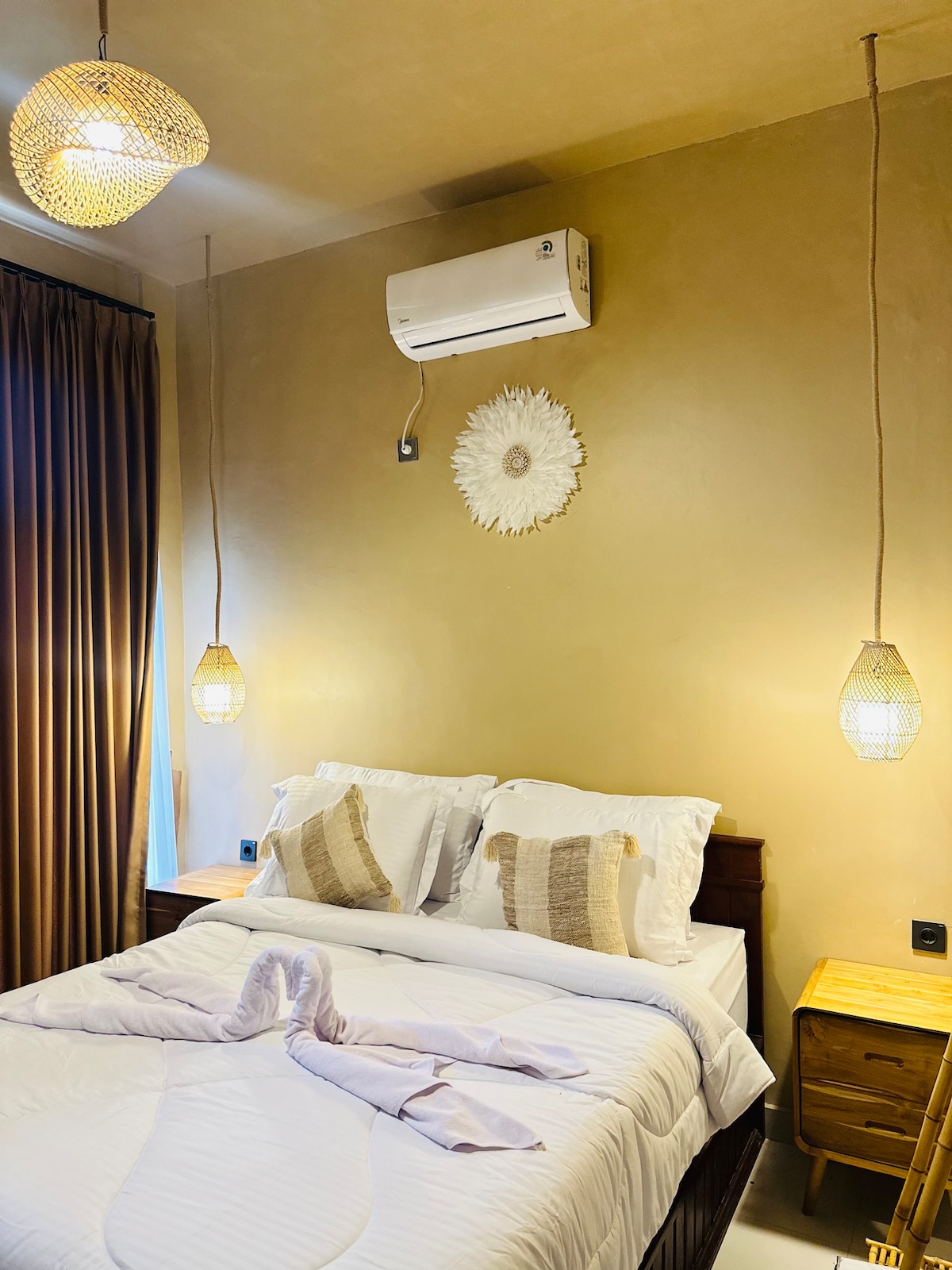 Immerse yourself in traditional design and comfort, complete with fresh linens and towels, A/C, and comfortable beds for a perfect night's sleep. Each room includes a cabinet and towel rack, as well as a private outdoor seating area for relaxation. Take a quick two-minute walk to the beach, where you can catch sight of playful dolphins, or dine at the delicious nearby restaurants and Warungs. Don't miss out on nearby attractions like breathtaking waterfalls and stunning temples.