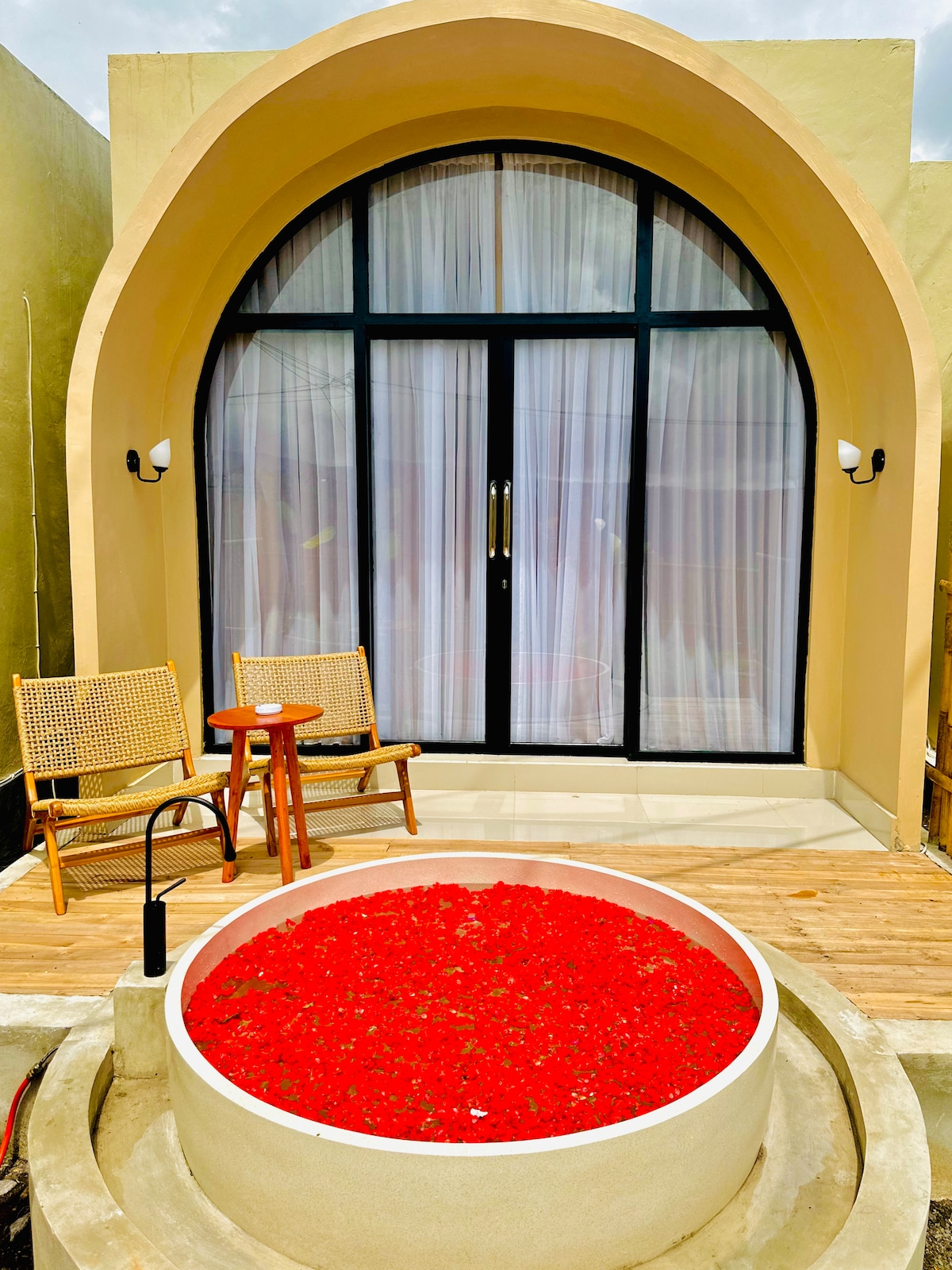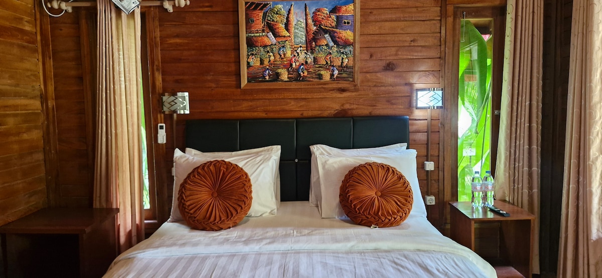 Immerse yourself in traditional design and comfort, complete with fresh linens and towels, A/C, and comfortable beds for a perfect night's sleep. Each room includes a cabinet and towel rack, as well as a private outdoor seating area for relaxation. Take a quick two-minute walk to the beach, where you can catch sight of playful dolphins, or dine at the delicious nearby restaurants and Warungs. Don't miss out on nearby attractions like breathtaking waterfalls and stunning temples.