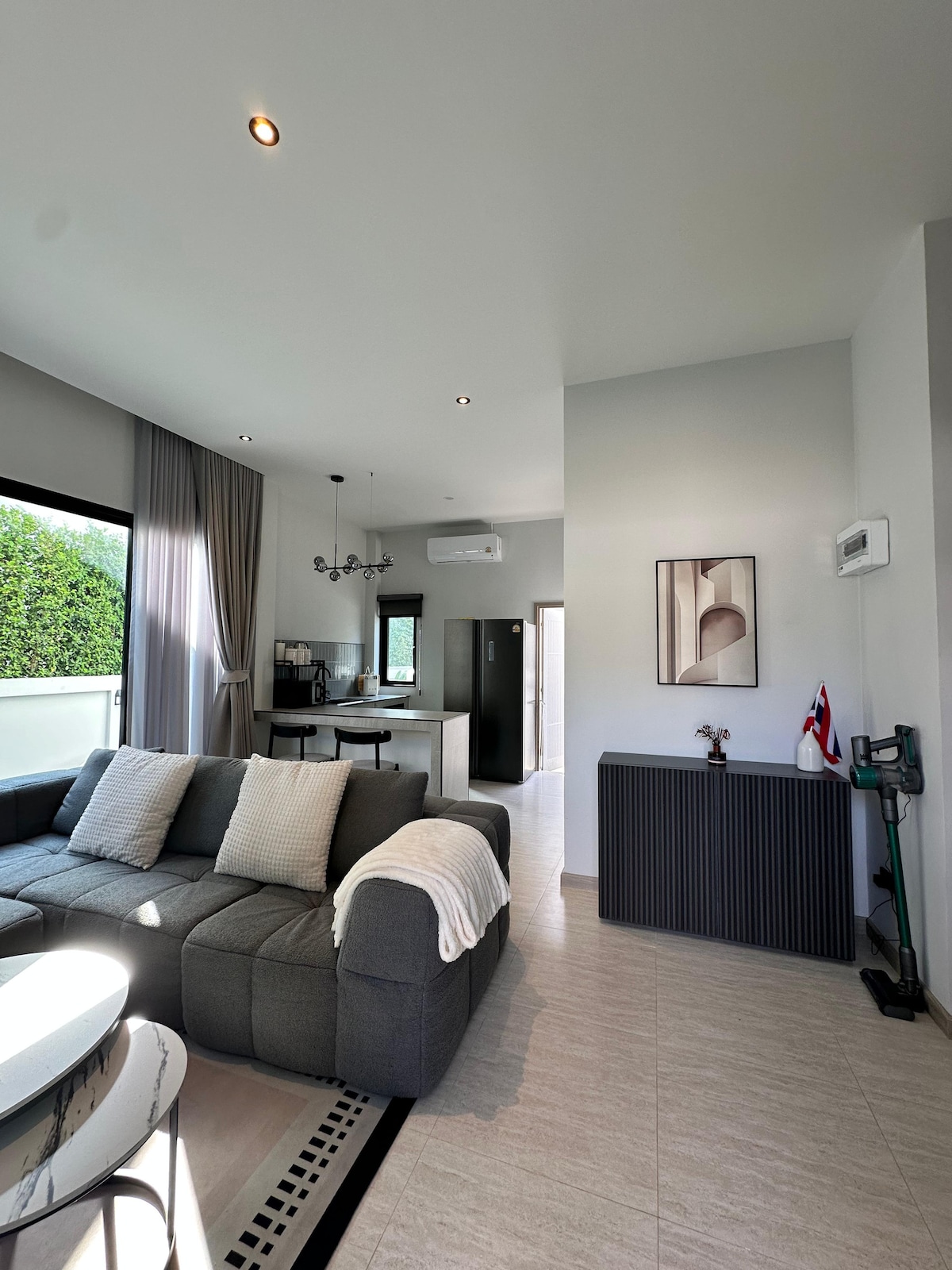 Stylish House Near the International Circuit This modern house is ideally located near Chang Arena (4.2 km), Chang Circuit Buriram (5.9 km), and Big C (1.5 km). The house: - Two high-quality bedrooms with comfortable queen-size beds - Two bathrooms - A living room - A fully equipped kitchen with a washing machine - 500 Mbps Wi-Fi and cable TV - Complimentary coffee and drinking water The two bedrooms are located on the SECOND floor, while downstairs you will find the living room and kitchen