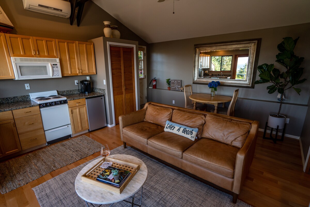 Perfect for Traveling Nurse, Business stays, Family vaca, or romantic get-away. Maybe you just need a place to unwind and Refresh! This is a Waterfront studio apartment w/ kitchenette, 48" HDTV, Qn bed + twin bed, Free WiFi. Free off-street parking (smaller or med-size cars fit best). Stroll our private sandy beach see Orcas, Seals, Otter, Eagles catching salmon all right outside your door! Enjoy nightly beach fires, amazing sunsets. Relax! (Sorry- no pets!)