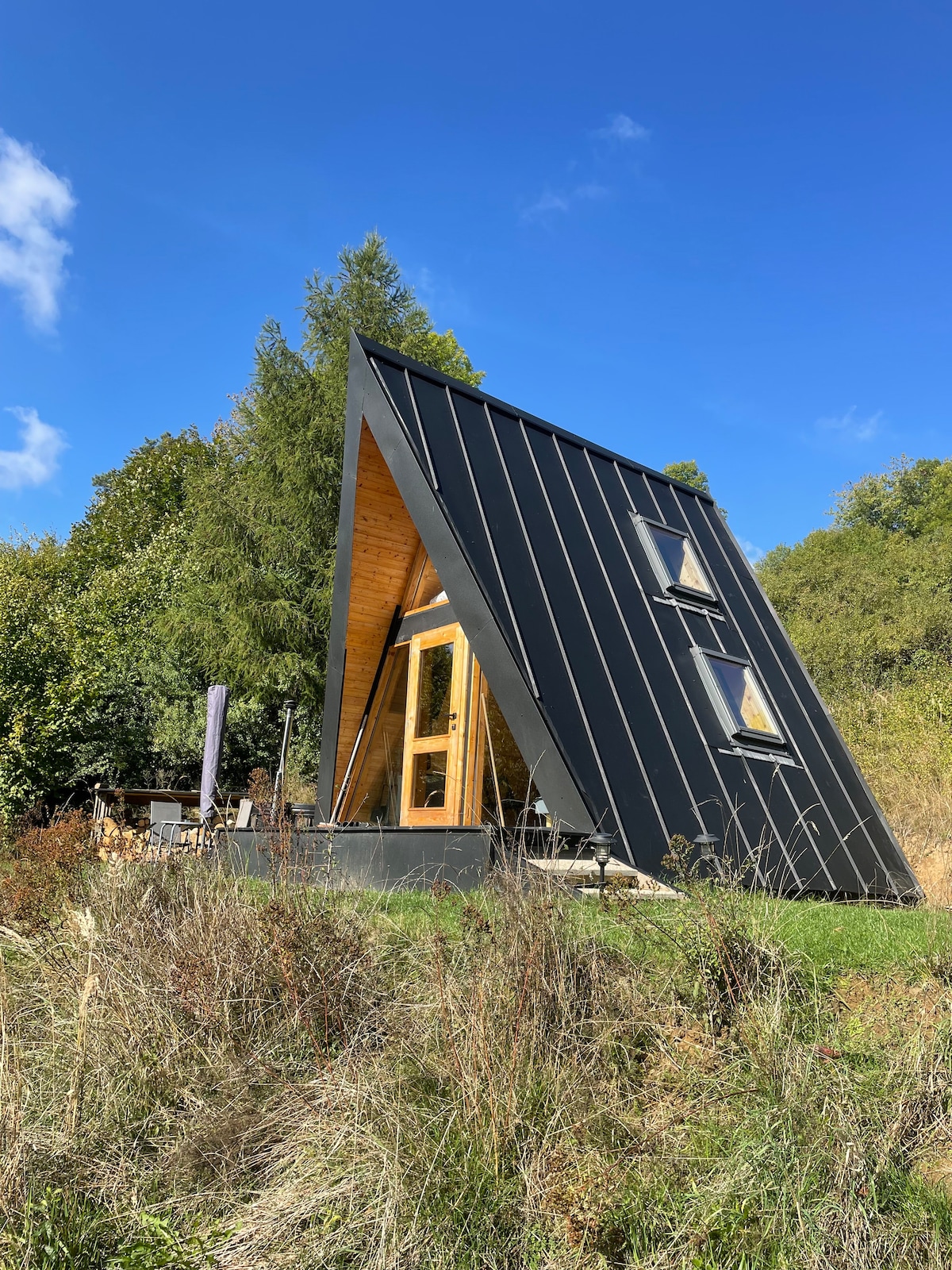 Year-round luxury and insulated A-frame cottage with a sloping roof, a whole glazed front measuring 4.5×4 meters with a terrace and a second floor. It is located on a clearing overlooking the treetops. On the property you will find an outdoor shower and a fantastic tub that you can fill both in summer and winter. The accommodation is intentionally without electricity so that everyone can enjoy peace and quiet from modern technology. Enjoy the beautiful surroundings of this romantic place in the heart of nature.