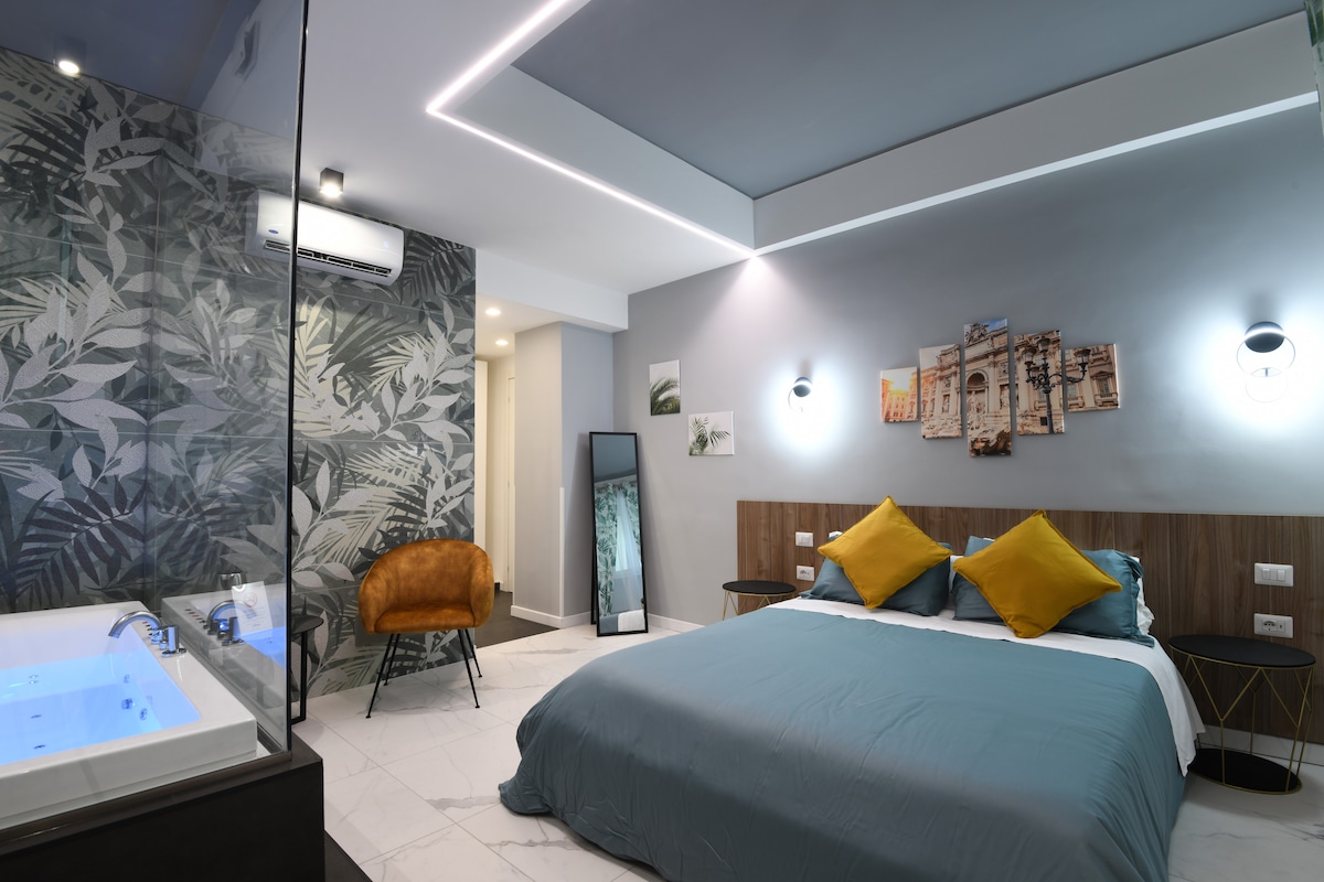 Luxury Art Deco style double room 100 meters from the Colosseum, with all amenities (40" Smart TV, air conditioning, daily housekeeping, minibar, laptop safe, desk, kettle with tea and coffee). The room has an elegant private marble bathroom. Room size is 14 square meters, including bathroom. Entrance with Self check- in (h24) with internet connection. We provide free APP with all information about monuments and restaurants in Rome.