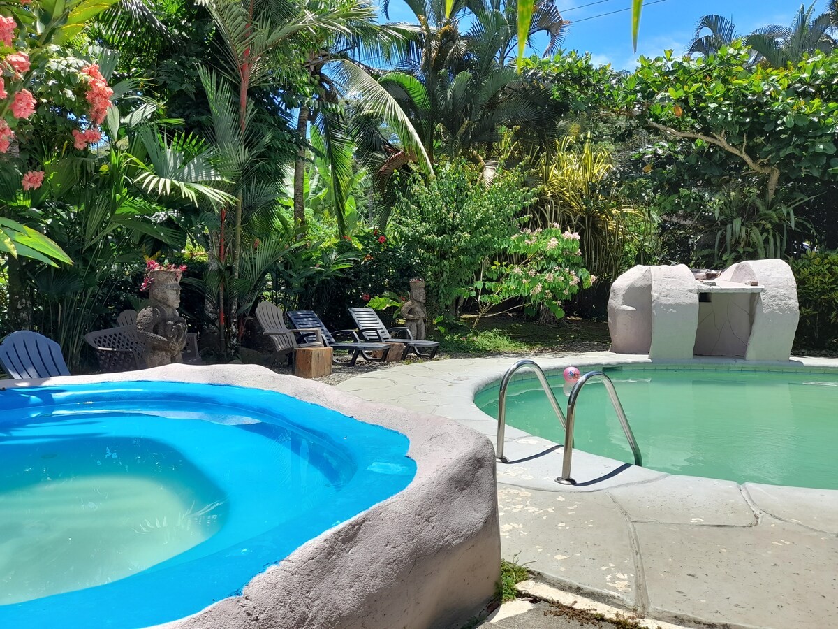 Charming boutique, adult-only hotel with three rooms, one 1-bedroom casita, and one 2-bedroom casa.* This room includes a private bathroom, full size bed, AC, hot water, bidet,linen, fan, closet and desk. Amenities: Pool, bar, Lounge, games, Outdoor shower, bikes, Shared kitchen, Bikes, WiFi, Gardens , limited Secured parking - (please request), Laundry, Barbecue/firepit. Just a 5-minute walk to the beach and a 15-minute walk to Puerto Viejo center. *Click host details for more info.