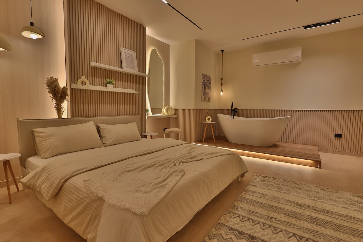 استوديو فاخر بتصميم مودرن وأجواء هادئة، ideal for couples & solo travelers. Enjoy a Luxury Studio featuring a freestanding bathtub, modern lighting, and warm wooden finishes for a relaxing stay. 📍 Prime location near City Stars Mall – Nasr City ✔️ Smart TV ✔️ Fast Wi-Fi ✔️ Air Conditioning ✔️ Fully equipped kitchenette ✔️ Workspace for remote work ✔️ Ground floor – easy access Perfect for romantic stays, business trips, or short city breaks. Clean, stylish & private.