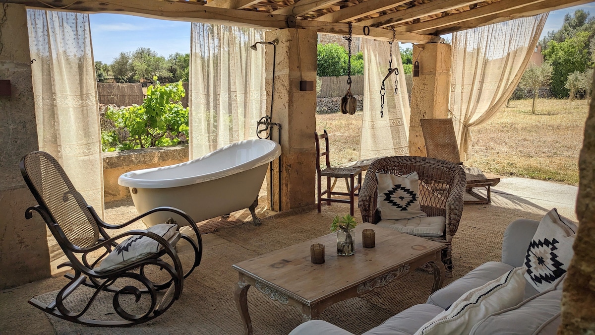 2 km outside the small village of Es Llombards/ Santanyi lies this small cosy finca for 2 persons. With a large living-dining room with kitchenette, a bedroom and a bathroom with shower, 2 people and toddler can spend a wonderful, peaceful holiday here. The outdoor area with plenty of seating and lounging options as well as sun and shade areas and an outdoor retro bathtub round off the comfort of the finca.