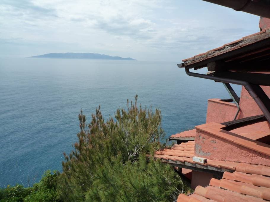In a condominium situated on a hill top opposite Giglio, 80sq mt appartment with its own private terrace , a spectacular view. Private small garden at the back The kitchen is fully equipped and light with a washing machine, and small fridge for drinks. In the entrance there is a fire for the colder months , big fridge for a weekly supply of food, and comfortable double sofa bed. English style bathroom with bath tub and huge window. Double bedroom with French windows plus an extra single bed.