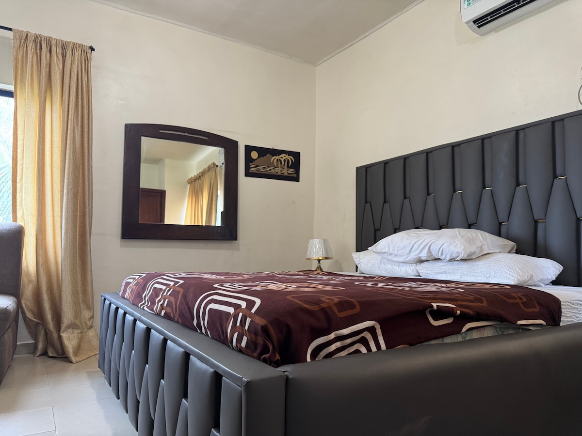 A suite comprising a sitting room and a bedroom, with bath tub, shower, powerful air conditioner, water heater, 32 inch television, two ceiling fans, nicely fitted lamps and nice decor throughout. Breakfast included. Discounted pricing.
