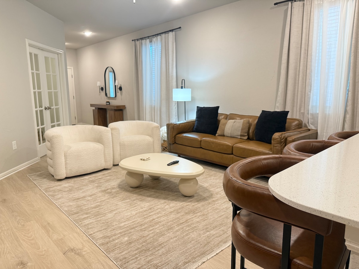 Welcome to your new home away from home! This oasis is conveniently located 20 minutes from Austin, 45 minutes from San Antonio, and 10 minutes from San Marcos. Enjoy the nearby food trucks, or let the kids have a blast at the playground, or the neighborhood pool. The stylish interior comes with modern comforts like a 75" TV, internet, games, outdoor patio, fire pit, & more. You'll be less than a mile from the Hospital & minutes to restaurants, shops, H-E-B, dog park, & the I-35 freeway.