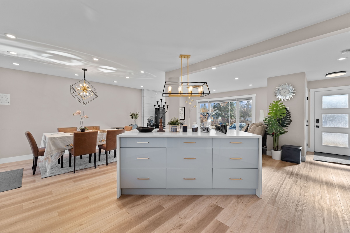 About the Blue Bungalow Enjoy your stay at 'The Blue Bungalow'. A 4 bed, 2 full bath tastefully renovated and decorated home in Southwest Calgary. It is fun, bright, and sleeps 8 comfortably, we have board games, foosball, arcade games, a chalk wall, two 55" TVs, A/C, a gas BBQ, and plenty of parking & a garage. It’s Nicely furnished, in a great location with plenty to do for everyone, see our list's below of highlights of our home & things near by. Perfect for your next Calgary stay