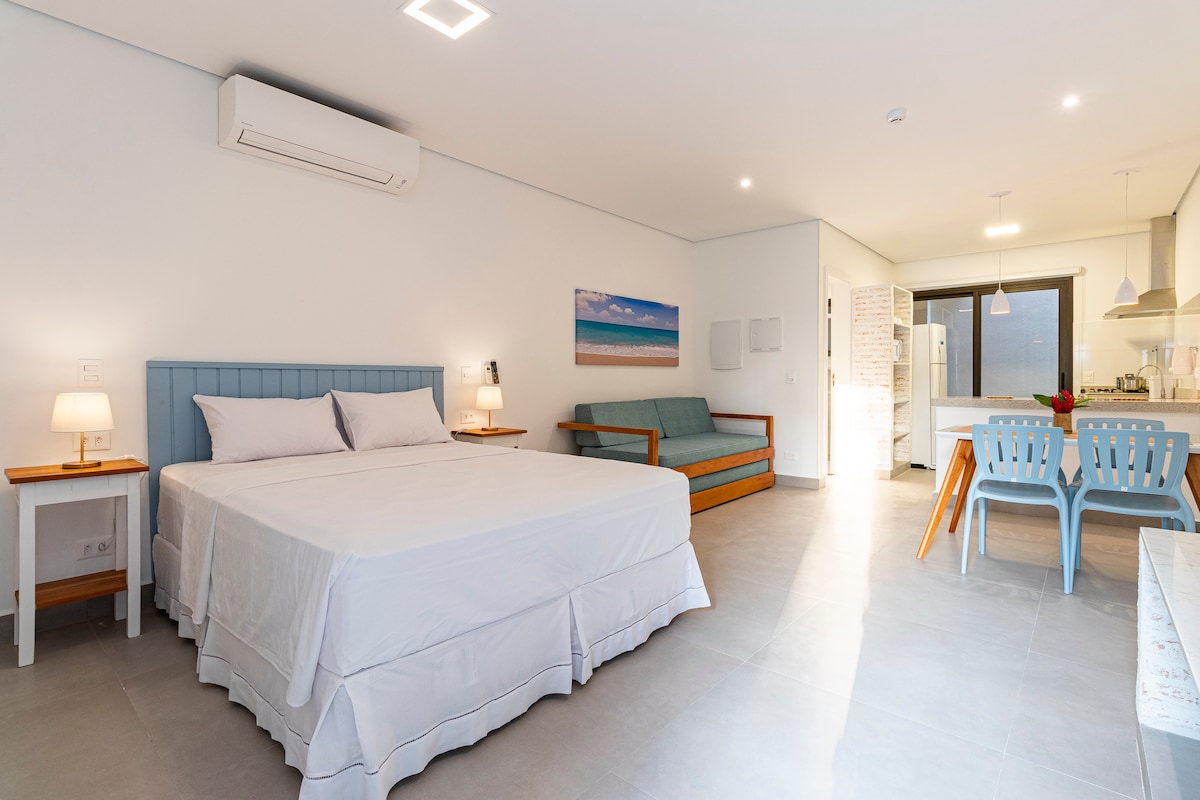 Comfortable and private studio for up to 4 people about 400m from Maresias beach. It has Air Conditioning, Wifi, Smart TV with Netflix and Youtube and other apps, balcony with network, parking, private kitchen equipped with microwave, refrigerator, stove, cooking utensils and water filter. Bed and bath linens are offered. Ambient temperature external pool. (Pages not allowed) 1 Car space available for the Apartment. We speak English and Spanish.