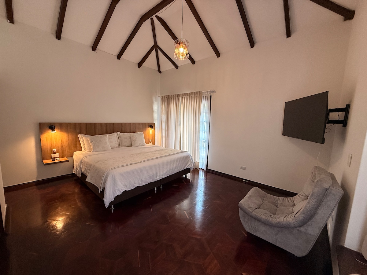 Room #3 in Jardín Secreto Boutique Inn: spacious suite with king-size bed, A/C, large TV and modern private bathroom with large shower. Includes breakfast and pool access. Located in Ciudad Jardín (south of Cali), the safest and most exclusive sector, close to restaurants, shopping centers, clinics, universities and main roads.