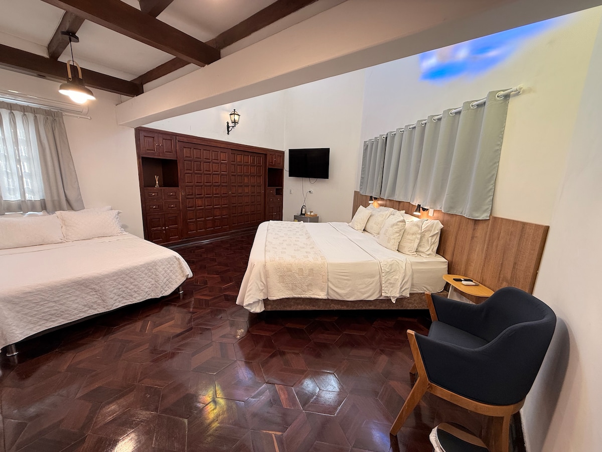 Habitación orientada a patio interior, ideal para quienes priorizan el silencio absoluto y un ambiente tranquilo para descansar. Al no tener vista directa a la calle, ofrece un descanso aún más profundo. Cuenta con cama queen, aire acondicionado, Smart TV, baño privado, clóset, caja fuerte, mini bodega para maletas, mini nevera y cafetera.