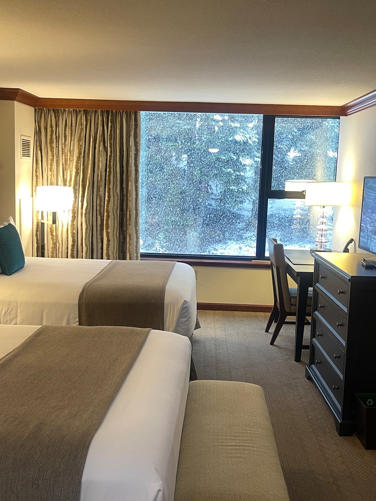 Forest View room in Luxurious 4 Star Everline Hotel Sleeps 4. Your mountain haven features two queen beds. This condo has views of the trees from the 5th floor. This is one of two ski in/ski out properties at Palisades/Alpine Resort at Tahoe (Everline & Red Wolf). Bathroom floor & entrance/coffee station feature granite countertops and slate flooring. Open the door of your room, walk down the hallway, step outside, snap into your skis, and get onto the lift! ⛷️🚠