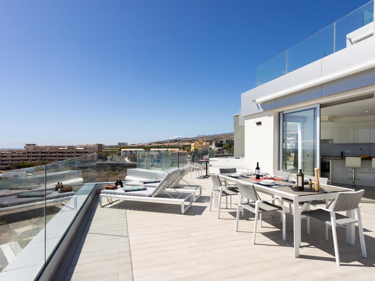 Be embrased by stunning ocean views and the soothing sound of waves “right at your feet,” bringing instant tranquility. Our modern penthouse has two spacious terraces with views of La Gomera and its unforgettable sunsets. In the evenings, the sky comes alive with vibrant colors. From the back terrace, enjoy the majestic Teide. Fully equipped with all amenities for a carefree stay, steps from the beach, cozy bars, and restaurants, this seaside paradise is your perfect Tenerife getaway.