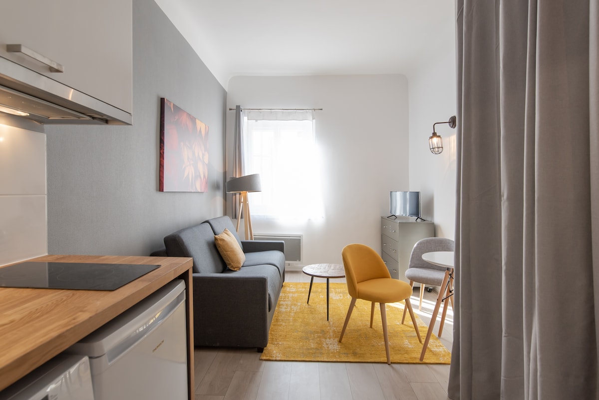Ce studio a été récemment rénové et joliment décoré afin que vous puissiez vous sentir comme chez vous ! Nous l'avons aménagé de l'essentiel des équipements pour un confort optimal. Un grand lit de 160 cm vous accueillera avec une literie soignée pour passer de bonnes nuits. Nous avons également crée un espace séjour pour vous détendre avec également un coin bureau pour travailler. La cuisine est fonctionnelle et équipée des essentiels. La salle de bain cosy et élégante saura vous séduire.