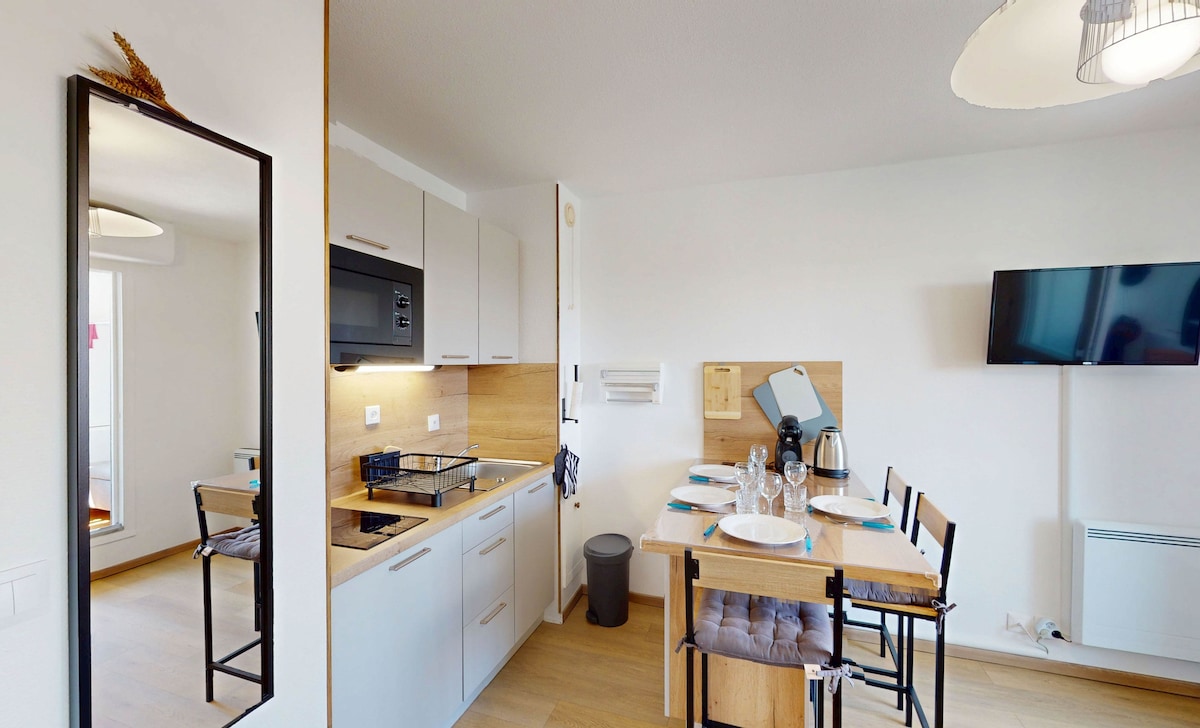 ➜ Two comfortable beds: a double bed and a convertible double sofa bed. ➜ 31 m2 ➜ High-speed Internet and TV: Fast WiFi connection and HD TV. ➜ Kitchen equipment: microwave, kettle and coffee maker. ➜ Thematic decoration: elegant atmosphere on the theme of the magnificent city of Paris ➜ Flexible arrival: between 2:00 p.m. and 10:00 p.m. ➜ Beach 15 minutes by car ➜ Secure building Book now and enjoy your stay