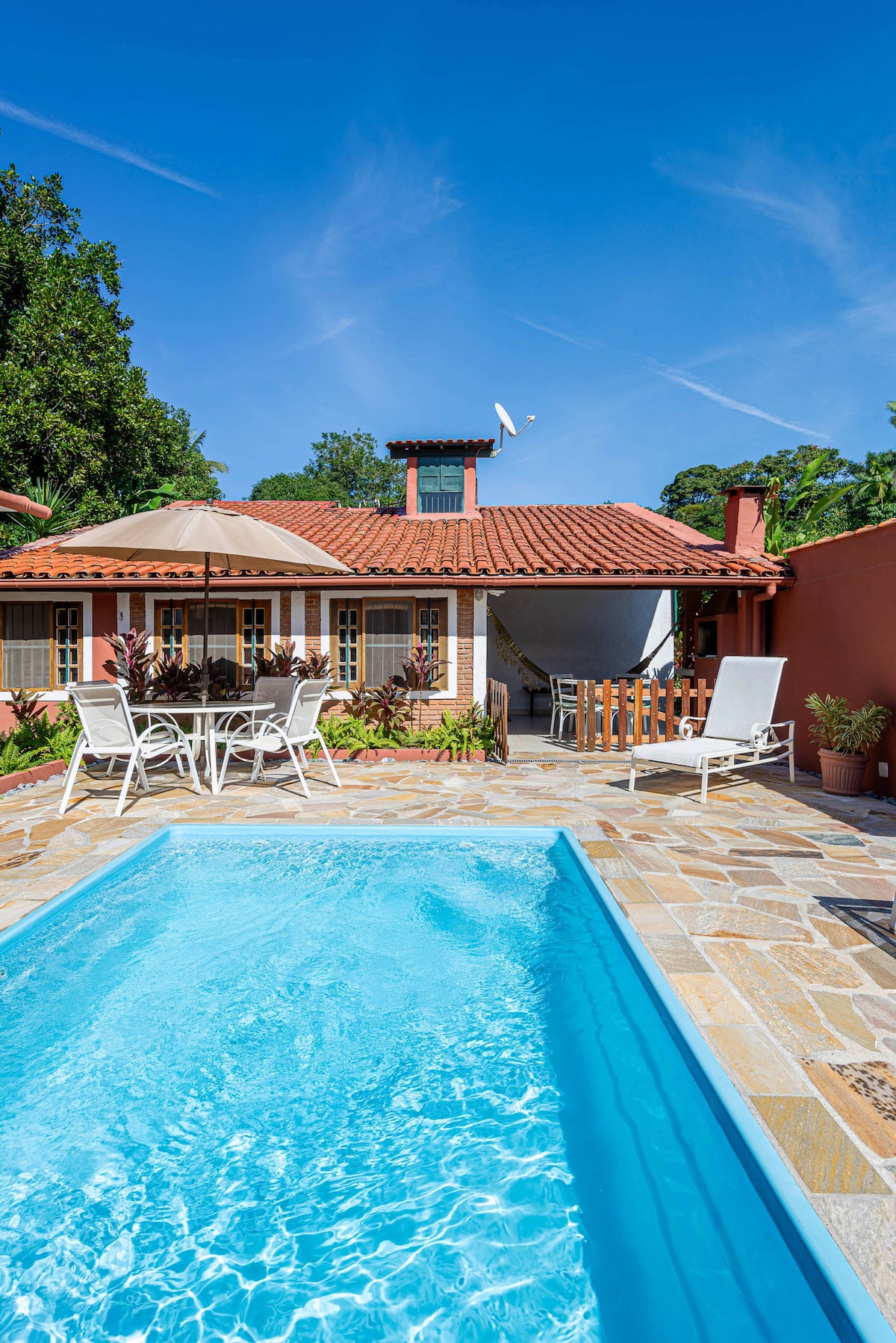 2 suítes e mezanino para 6 hospedes. Ar condicionado, Smart TV. Cozinha americana completa, varanda com rede e churrasqueira. Amplo gramado e estacionamento para 4 carros.Piscina privativa de 4X3 m., com espreguiçadeiras, mesas, cadeiras e guarda sol para refeições ao ar livre . Piscina protegida para segurança de crianças e pets.Taxa de R$250,00 para 2 pets. Podem ocorrer eventualmente falhas na internet, queda pontual de energia elétrica e barulhos de obras e outros nas vizinhancas