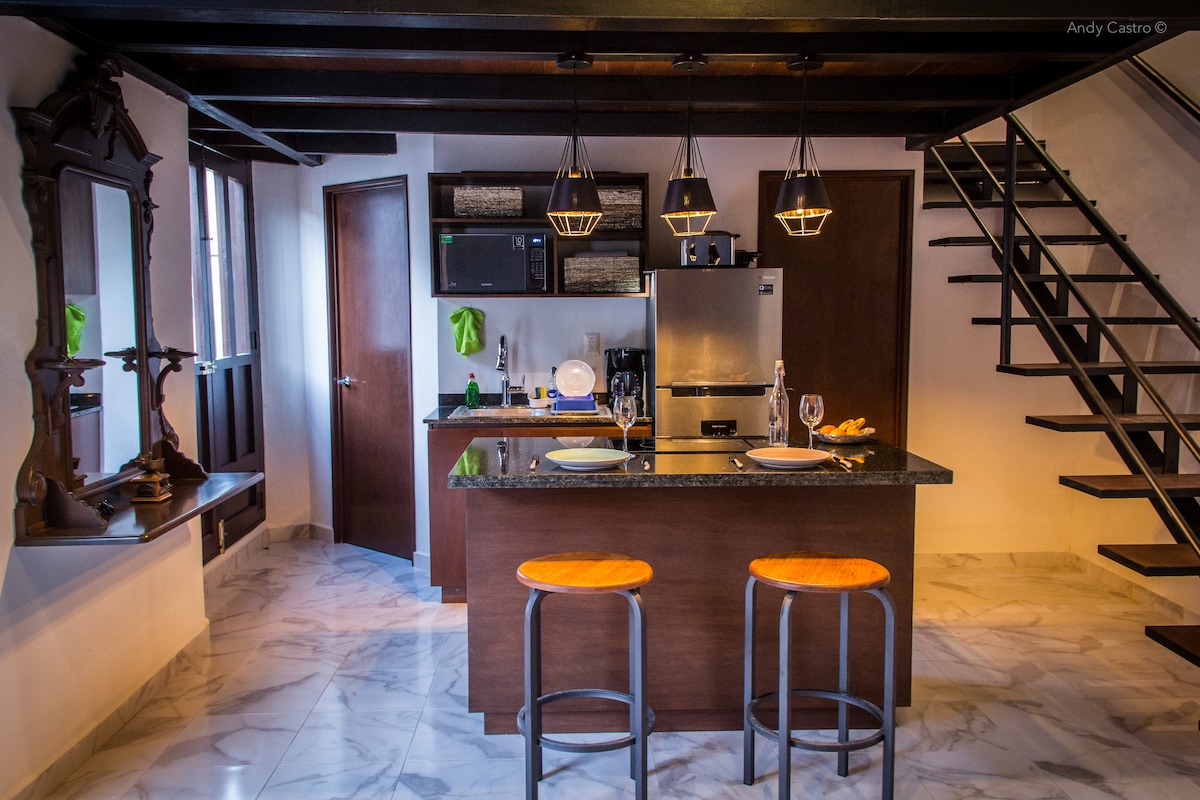 Practical and cozy modernized colonial loft in the San Román neighborhood with private parking space 50 meters away. The loft is air-conditioned and offers what you need for a comfortable stay, a few steps from the pier. We have a kitchenette and a small refrigerator for basic services. If you're going to walk to the historic center, the loft is a 15-minute walk and a 5-minute drive away. We're on a corner where cars pass by mainly during the day.