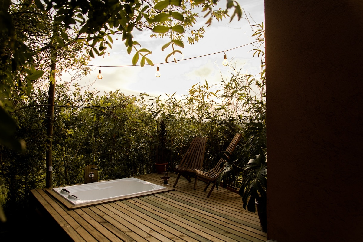 The Cabana Encanto da Natureza is a 57 m² retreat with integrated environments and lots of natural light. Built 2.30 m from the ground, it offers the unique feeling of being in a treehouse, surrounded by greenery. Ideal for rest and connection with nature, it has a whirlpool to relax and air conditioning for total comfort. Capacity: 1 couple (2 people).