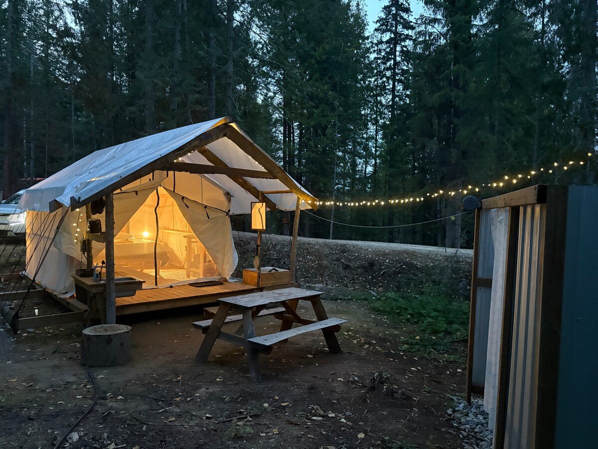 Reconnect with nature at this unforgettable getaway. Stay in your own glamping tent in the cedar forest. This is a beautiful private site just up a small hill. There's a queen size bed and single burner kitchenette. There is power, water, a private shower and wifi. The outhouse is a short 20 meter walk through the forest. Electric blanket for cool nights! We have two tents onsite, so if you are coming with friends and they are both available, book both! Cats are not permitted.
