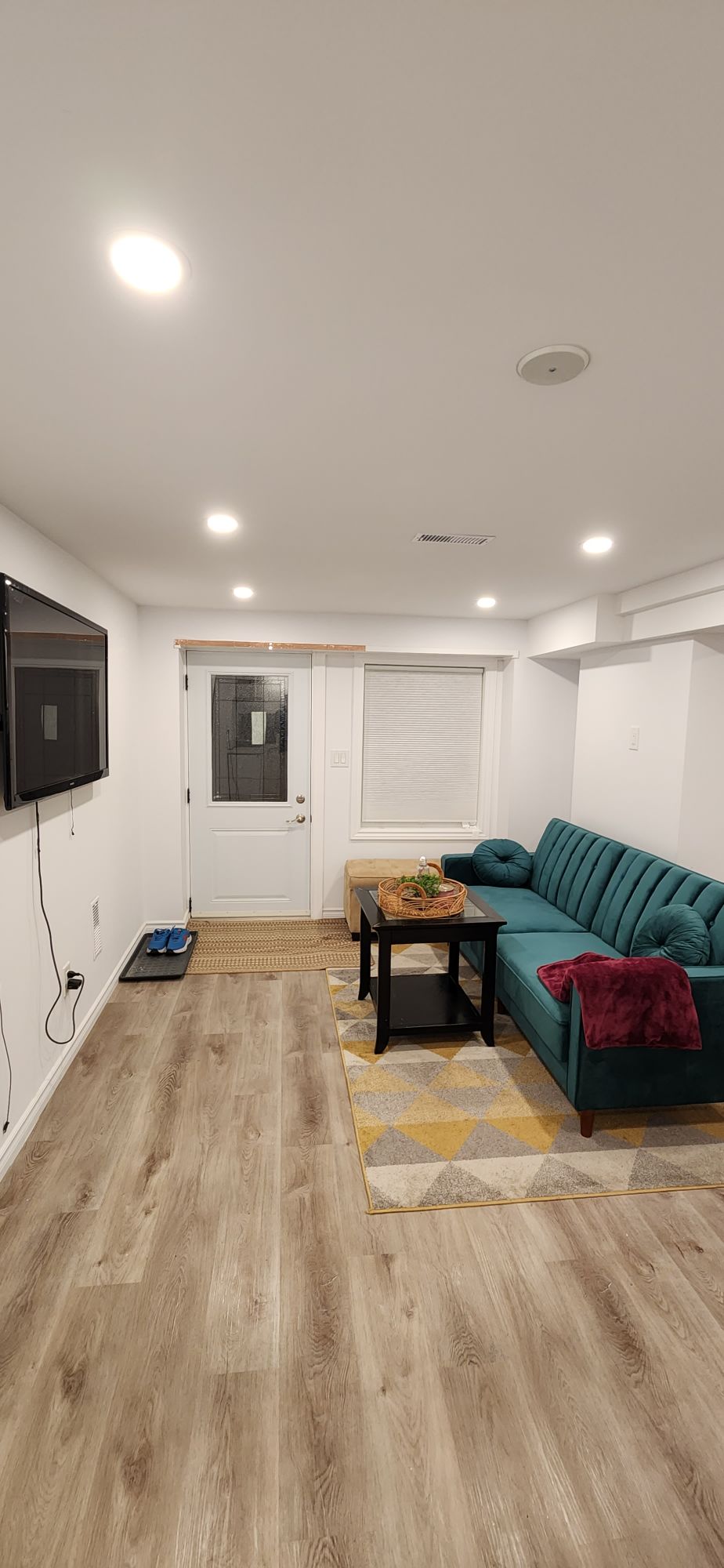 Newly finished spacious basement with 8' ceilings and plenty of natural light! Perfect for a romantic getaway or for mature professionals on business. Steps to Locke Street's dining and shops, as well as parks, hospitals, and downtown Hamilton. Features include in-floor heating, 55" 4k TV, a custom kitchen, and laundry. Sleeps 4 with Queen bed in bedroom and pull-out Queen mattress in the sitting room. Free street parking and anytime self check-in.
