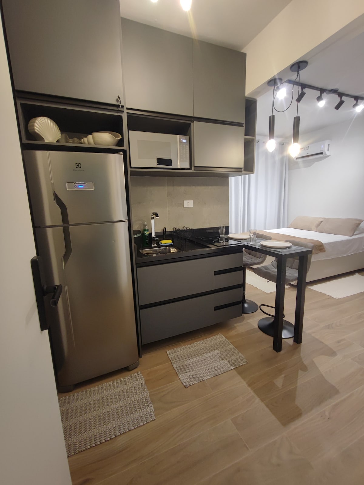 Keep it simple at this peaceful and centrally-located place - on the beach block, in front of the Aquarium, a traditional tourist spot in Santos. The furniture is functional, with a comfortable sofa bed and a bed with an upholstered headboard that invites you to rest. Each item, from the shower, air-conditioning, mattress to the decorative accessories, was thought out with affection to convey warmth and comfort. The compact kitchen is practical with state-of-the-art appliances.
