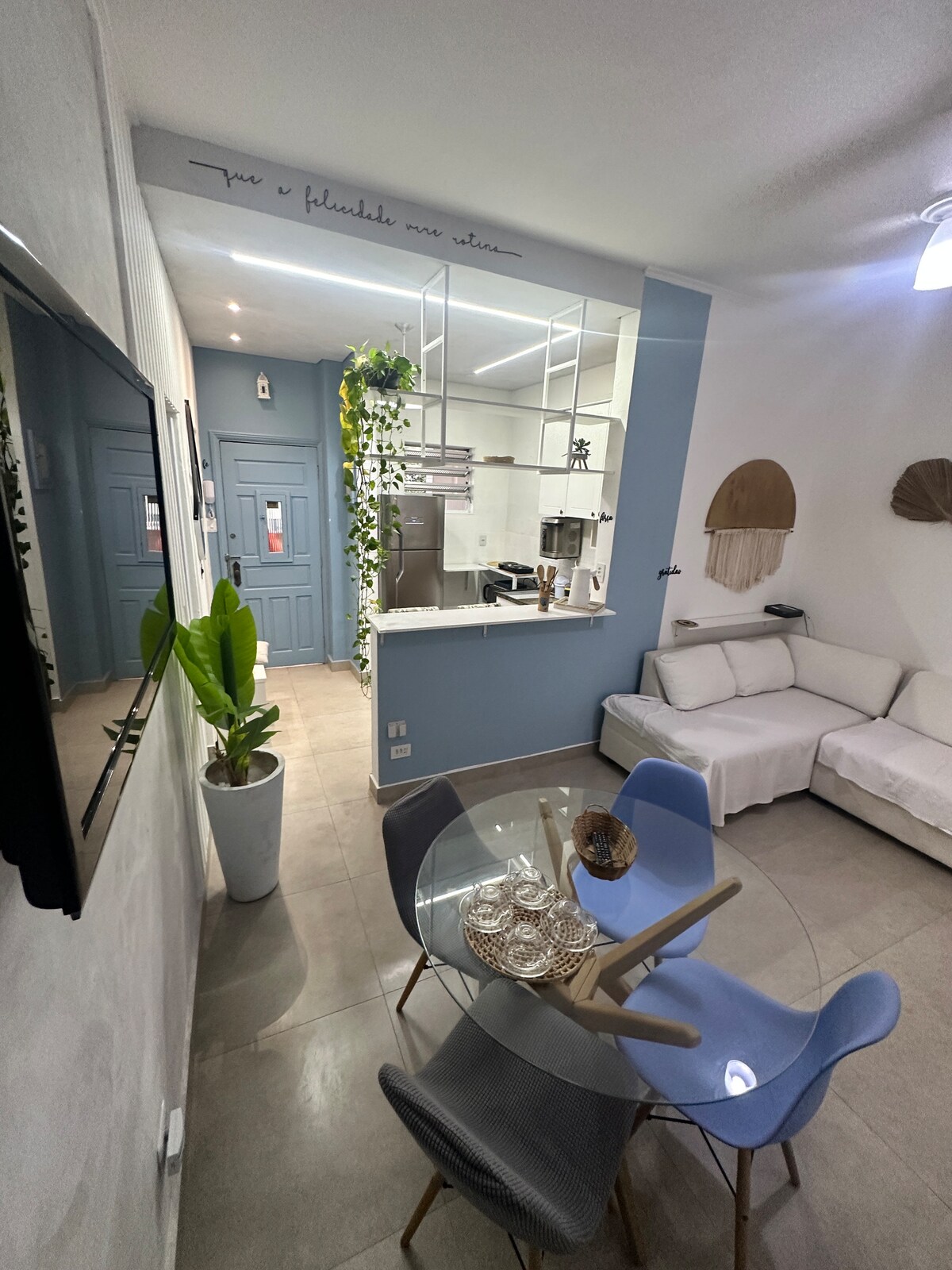 Welcome to our little corner in Guarujá! Our apartment was designed for families, including pets, and accommodates up to 4 people! Super well located, just a 10-minute walk to Enseada Beach, our apartment is surrounded by markets, restaurants, pharmacies and Pets The beach is just a 10-minute walk away, and the apartment also has the entire structure for a Home Office, with high-speed internet, a monitor, and a wireless keyboard and mouse kit. Come and see for yourself and you'll be charmed!