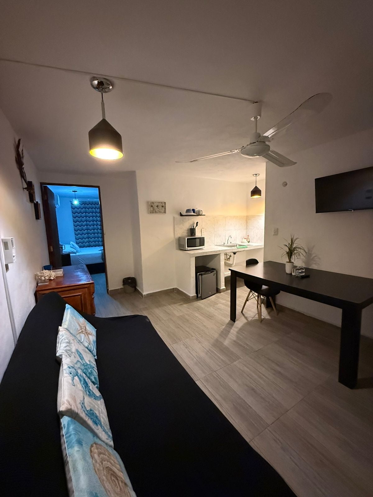 Recently renovated studio located right in the heart of the Cancun hotel zone, with a beautiful terrace and a breathless ocean view near by restaurants and night live fun activities. The studio has a modern touch with a beautiful terrace to spend time and enjoy the view and the ocean sounds with a cup of coffee, some wine or simply relax in the hammock. It has two queen size beds, a sofa type bed, a well equipped kitchenet and a dining table. It also has a flat screen tv and wifi service.