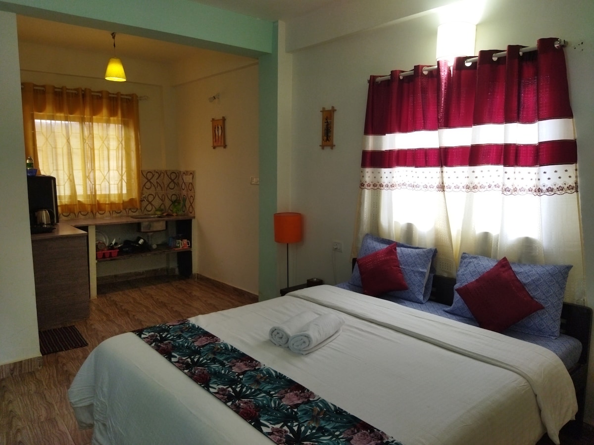 Sanitizing is important to us. We will not mingle with guests.Private gated green property with flowering and fruit bearing plants/ tree's as well as two lawn's and a sit out. Close to the main road yet far away from the bustling noise, restaurants and shops all within walking distance.A 5 minutes walk to the beach. Come relax.!The room is sanitized after every guest checks out,as per Airbnb norms. You are responsible for room house keeping,keep the room clean.Details of listing please read.