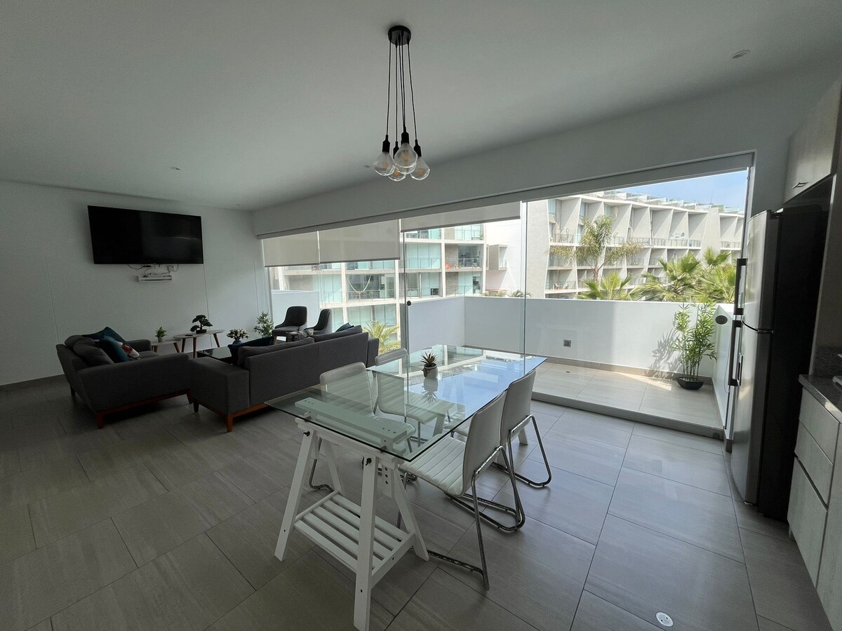 New apartment with ocean view, 5 blocks from the beach. It has 2 swimming pools, a grill area, a soccer field, basketball, children's games and income for people with disabilities. If you are looking to celebrate your birthday, a romantic getaway, or be with the family this is your place. Enjoy the new Punta Mar mall just 5 minutes away and the KM 40 shopping center with a variety of stores such as Wong and the Smart Fit Gym, in addition to a variety of nightclubs.