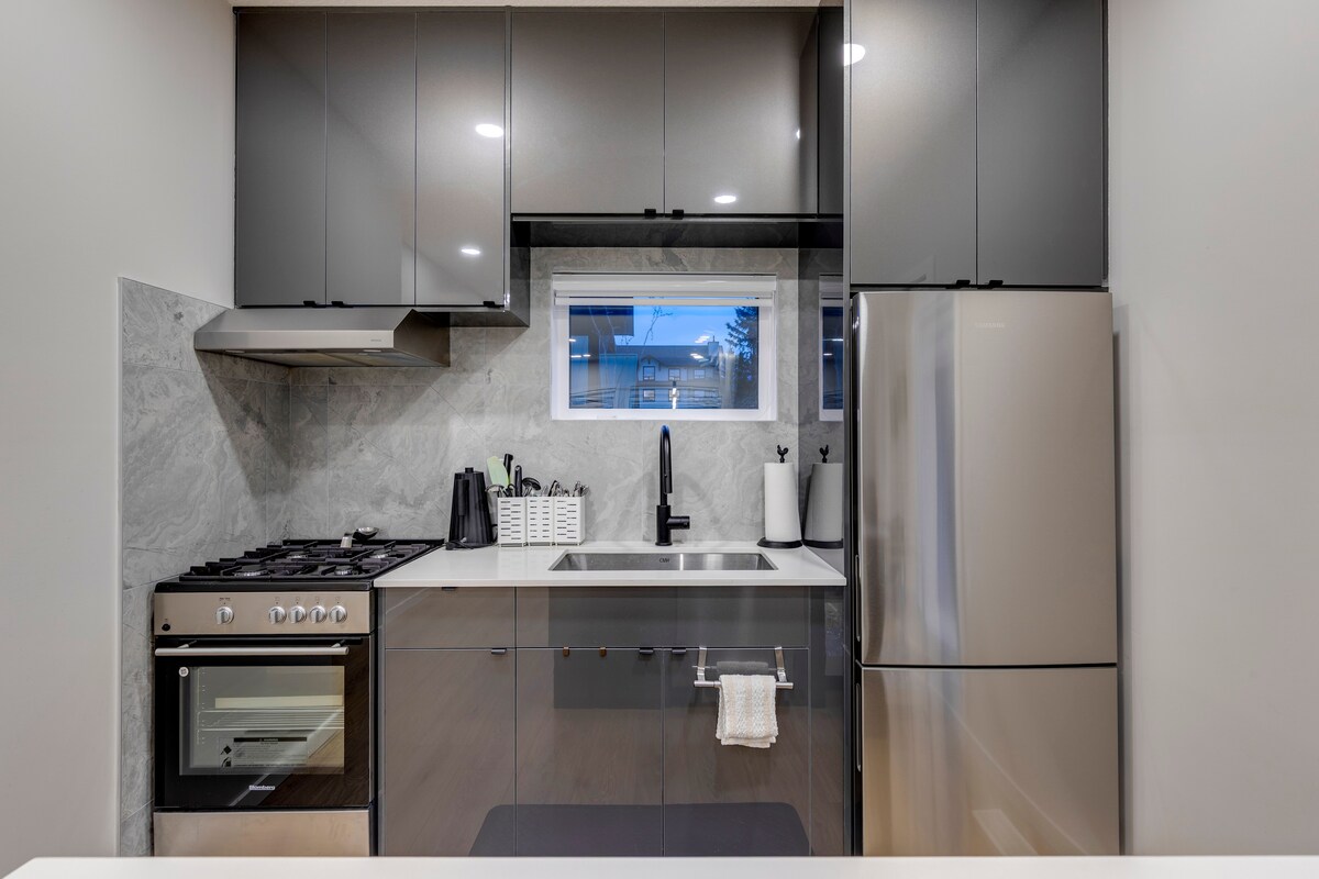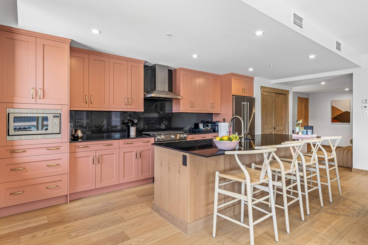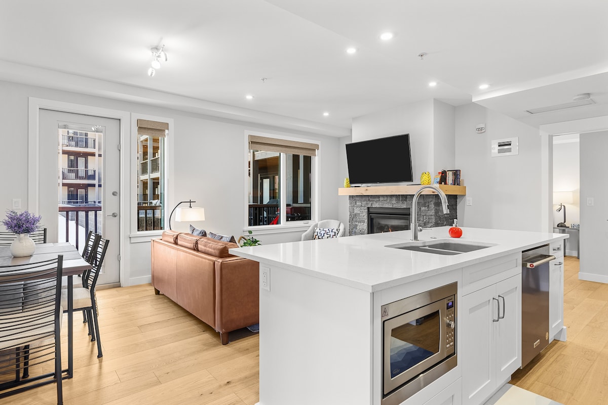 Welcome to your luxurious mountain retreat! This brand-new one-bedroom king suite accommodates up to 4 guests. Just a 10-minute walk from the town center, the suite features a king-sized bed, a pull-out sofa bed, one bathroom, a fully equipped modern kitchen, flat-screen TVs, a washer/dryer, and luxurious linens and towels. The suite includes access to a hot tub, gym, and one underground parking space. Short-term rental license: RES-09776