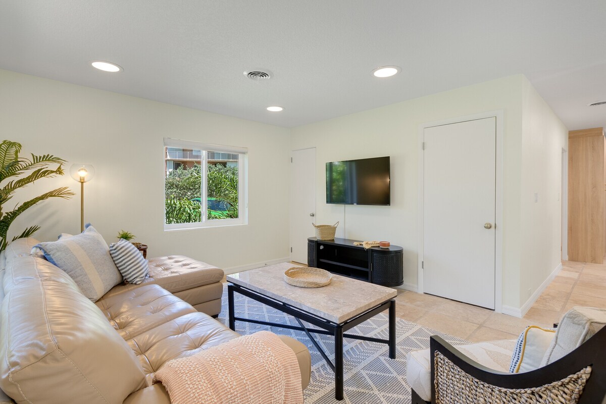 Beautiful 2 Bedroom, 2 Bath Condo on first level. Condo has a water feature and a partial pool view. Unit newly updated. New Front door, Patio Slider, paint and flooring. Condo is completely stocked for cooking your favorite meal. We love this space and the condo being so centrally located on beachside! Green Turtle grocery is just steps away from our unit. Bagle shop and a Starbucks just across the street. Many other restaurants, grocery stores and beach, just a short walk away!