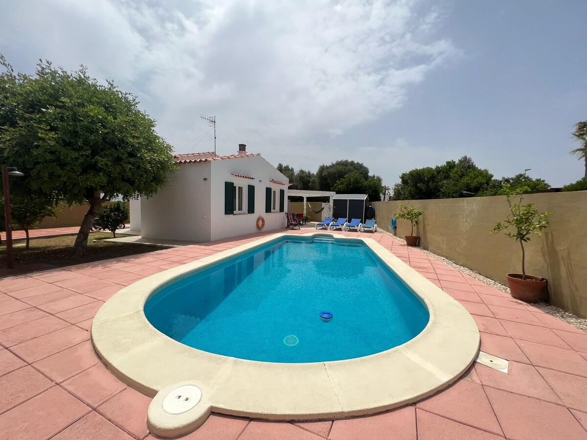 One-story house with private pool (6 x 3 meters) and barbecue. Great for family vacations. It stands out its great privacy. 10 minute walk to the beach and close to supermarket and restaurants. Just steps from one of the best sunsets on the island. It has 2 bedrooms, 1 bathroom, living room with kitchen, porch/dining room, also outdoor shower, laundry and private parking space. About 5-6 minutes away by car from Ciutadella centro. ET1958ME