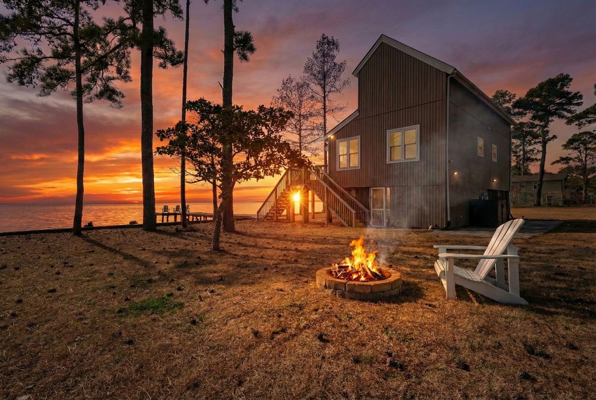 Welcome to "Seas the Bay" surrounded by water and majestic live oaks! This quaint 1,000 sqft cottage offers stunning views of Kitty Hawk Bay from the house, deck, & dock. Just 5 min from the beach, local food, & nightlife. Our dock on the bay is a perfect place to enjoy sunrises on the water. This listing is for 4 guests, perfect for a family, friends, or couples. Another airbnb rental is on the same property to the left, there is shared parking, but no living spaces shared.