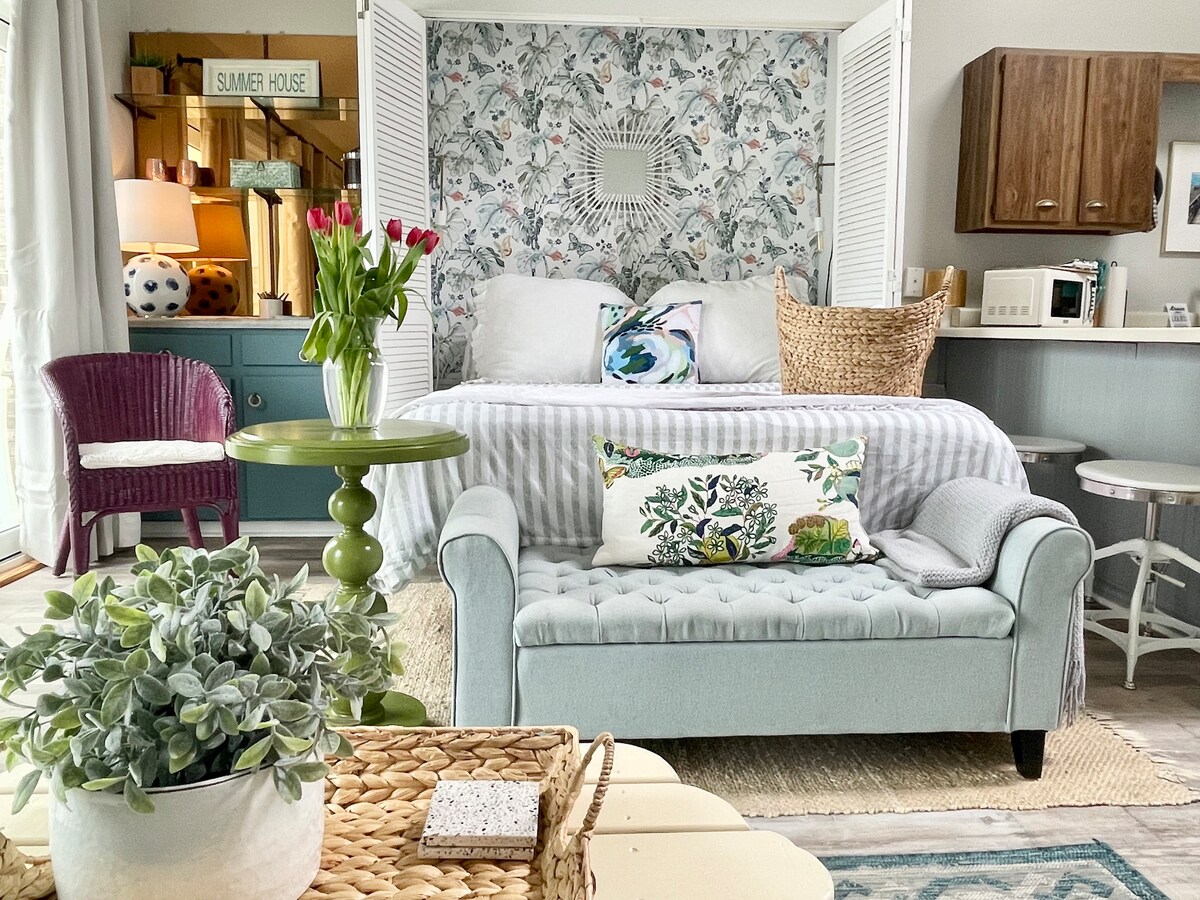 This private 544 sq ft nautical-themed bungalow features one large room with an open sleeping loft (2nd bedroom) overlooking the main floor. Downstairs is furnished with two rockers, sofa, queen-size Murphy bed, TV, dining table. There is a full bed & twin bed in the loft. Ideal for 4 guests, but accommodates 5. The kitchenette has basics (microwave, toaster oven, Keurig, small fridge) not equipped for cooking meals. Off-street parking & room for a boat trailer. No Pets/Smoking
