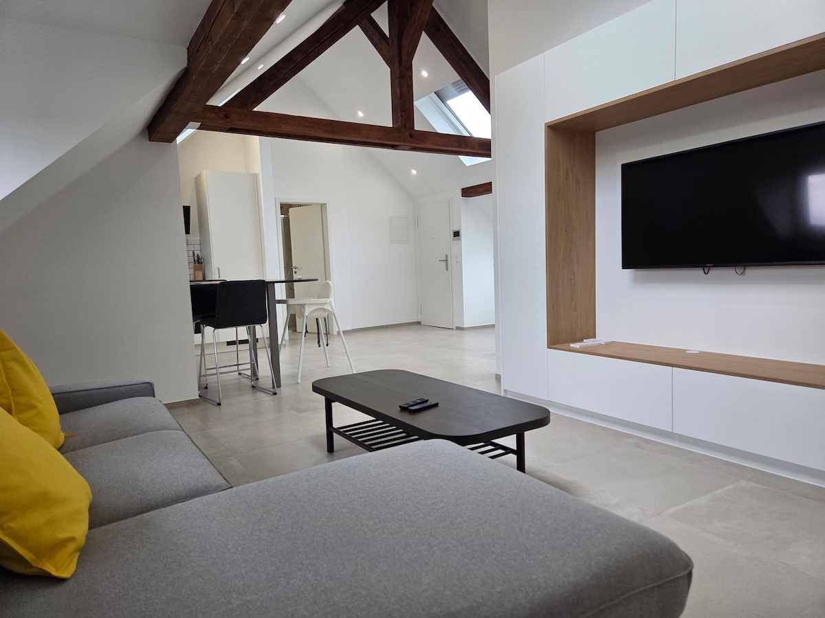 Discover your Luxembourg haven in our modern, 3-unit building. This chic, spacious 1st-floor apartment offers a stylish bedroom overlooking woods, perfect for relaxation or work, with a desk included. It features a convertible sofa bed, a fully equipped kitchen, and access to a communal laundry with washer and dryer. You'll also enjoy fast cable wifi and a large flatscreen. One private parking space on the buildings driveway is included.