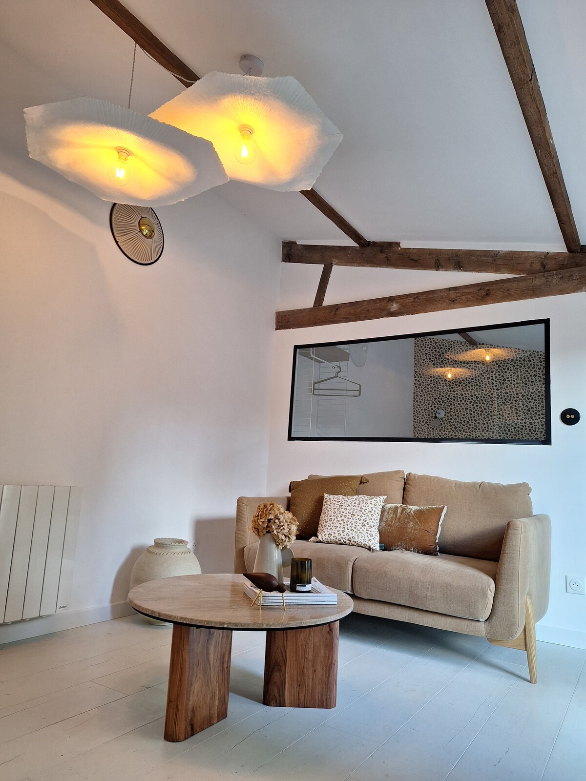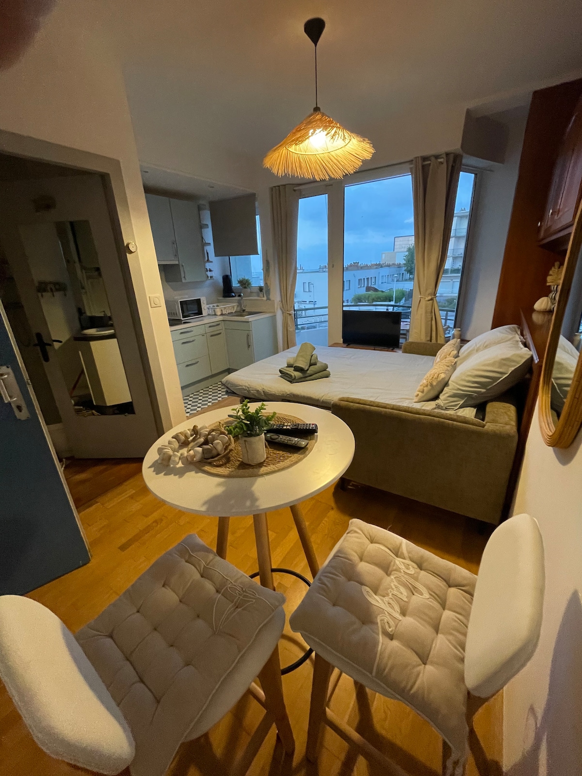Welcome to Studio Le Plumard Bleu. Ideal for workers or couples, free street parking, 3 min from the highway, 10 min walk to the train station, free bus 50 m away takes you to the beach (C3). Quiet neighborhood, perfect for remote working (Wi-Fi). Bright studio (with shutters) located in a completely renovated (thermal and functional) post-war building and rated 2 stars. It is distinguished by its design combining custom spaces and elegant and sparkling decoration.