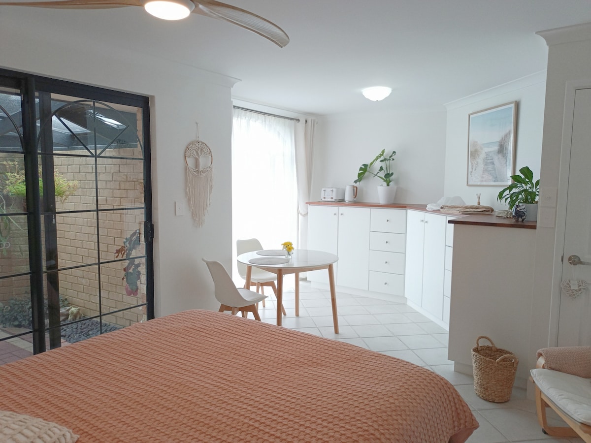 Located in a quiet part of OLD Quinns, the studio is light and airy , with plenty of windows to catch fresh sea breezes....leave the windows open and some nights you might even smell the ocean. Even with blockout blinds the sun may not wake you but the birds might ! We have lots of Willy Wagtails & Pink & Grey Galahs. From the deck or the couch , enjoy the glorious views over the Nature Reserve filled with grasstrees. Please note that bookings including children will not be accepted.