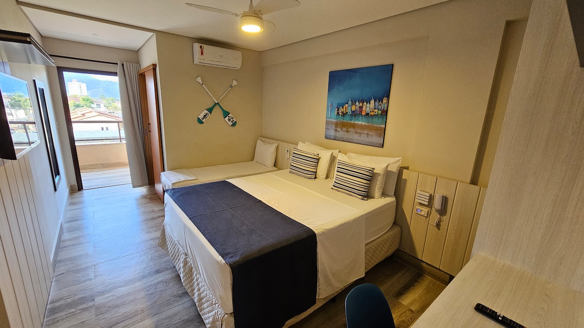 You won't want to leave this charming and unique place. A very comfortable accommodation, equipped with: box Queen bed and an extra single bed, Smart TV, ceiling fan, hair dryer and shower. All Exclusive Suites have a balcony, as they are located on the 1st and 2nd floor, with access by elevator. A high-end Suite with an affordable price!! It accommodates up to 3 people with two in the double bed and one in an extra single bed. For children under 2, see by message.