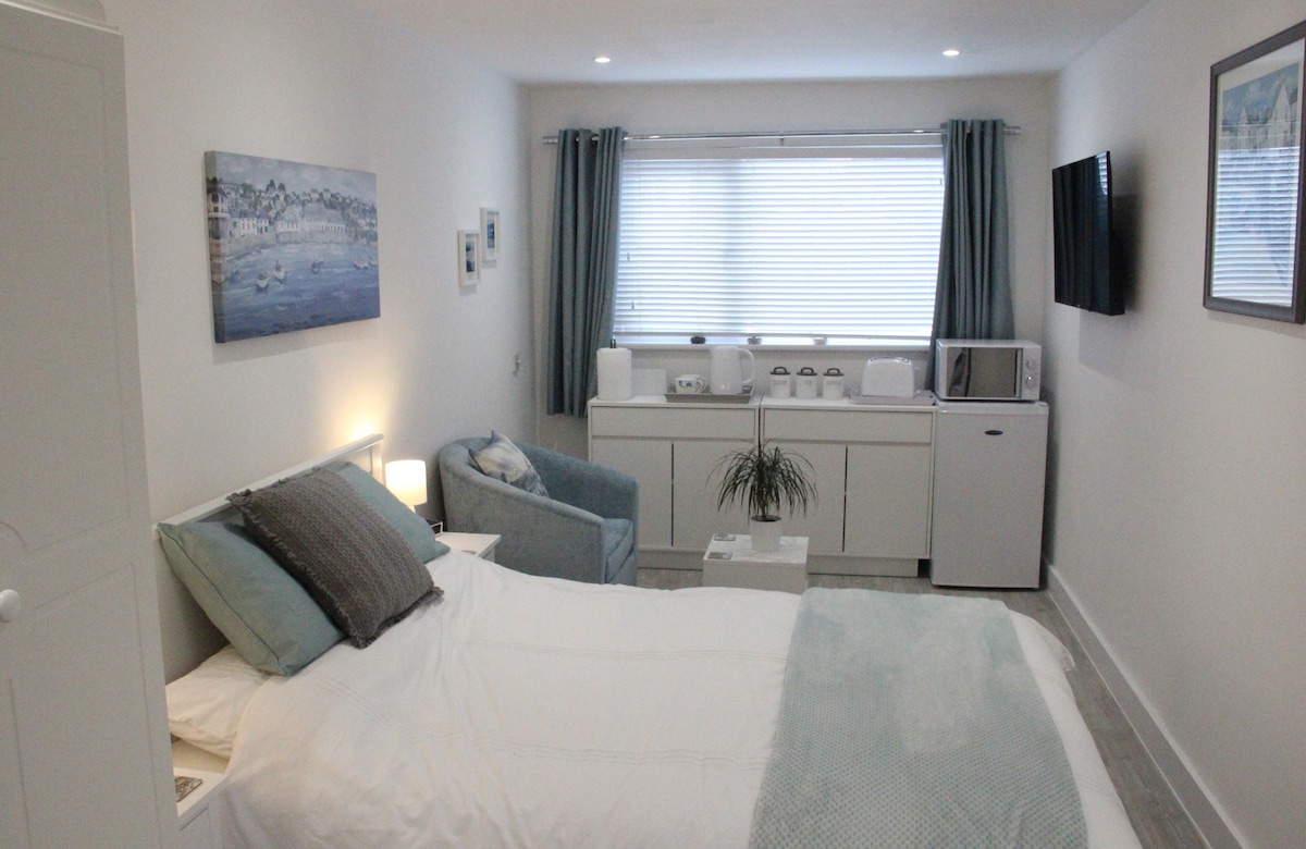 Luxury, Modern, Open plan studio for two adults and one infant. Parking, EV charger, double bed, sofa bed, Wi-Fi, televisions, mood lighting, kitchenette bar, patio. Painted in ultra low VOC, sustainable paint. Park 3 metres from the front door. Relax on the Emma Mattress bed or unwind on the sofa whilst watching 4K smart TV (both areas). Cool your drinks and ice cream in the fridge-freezer or mix a cocktail. For breakfast utilise the espresso machine, toaster, kettle and microwave.