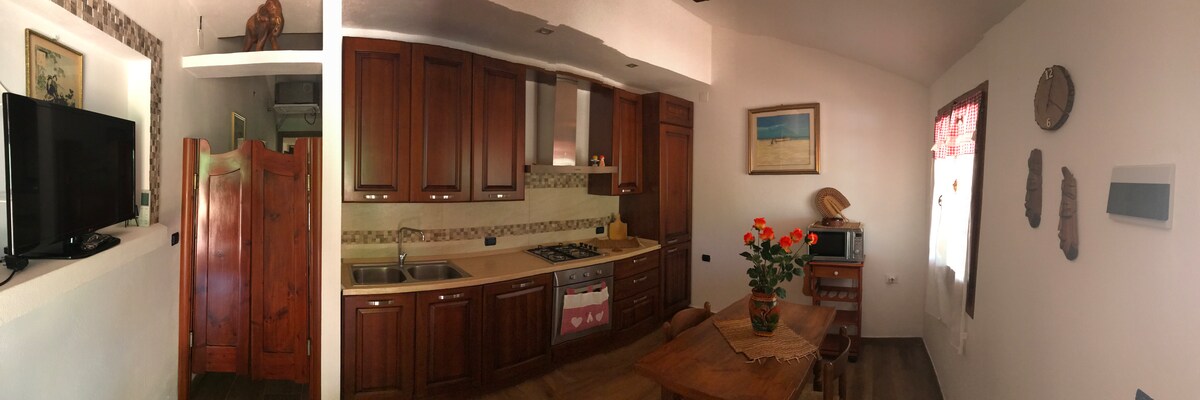Apartment located on the second floor, with independent entrance 2 bedrooms, one with a covered terrace, open space equipped with TV and fully equipped kitchen with adjacent terrace overlooking the sea equipped with the necessary for lunch/dinner outdoors Space with washing machine, shower box and a bathroom with bathtub Air-conditioned in all rooms Spare linen and beach towels on request 50 meters away, bars, restaurants, bus stop and shuttle to reach the beaches of Masua and Porto Flavia